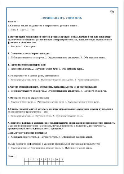 - Рабочий лист 1. Задание: ответить на 10 вопросов по теории с выбором верного ответа; соотнести стиль с текстом (3 варианта задания по 5 стилей и 5 текстов); соотнести лексические и синтаксические термины с конкретными примерами (50 предложений); Определить языковой стиль и тип речи в 8 текстах.