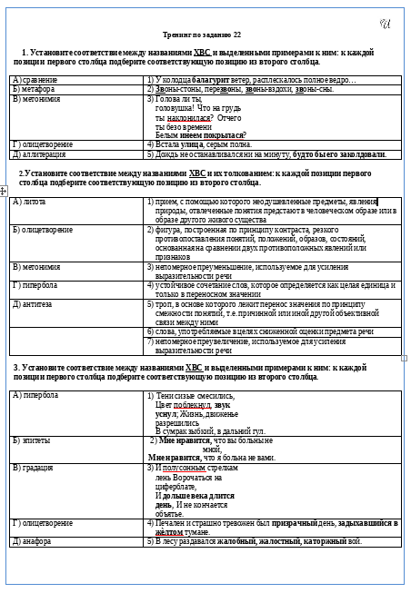 1 ступень – это начальный уровень. В этот блок включены достаточно простые задания, в которых к каждому из 5 терминов подходит один из 5 примеров (формат 5 на 5). Учащиеся приучаются находить в примерах нужное средство художественной выразительности, привыкают к маркировке, используемой в задании, и применяют по необходимости «метод исключения». Кроме того, в этом блоке есть задания для проверки теоретических знаний: необходимо сопоставить определение термина и сам термин. Эта ступень состоит из 12 номеров (7 практических заданий и 5 теоретических)