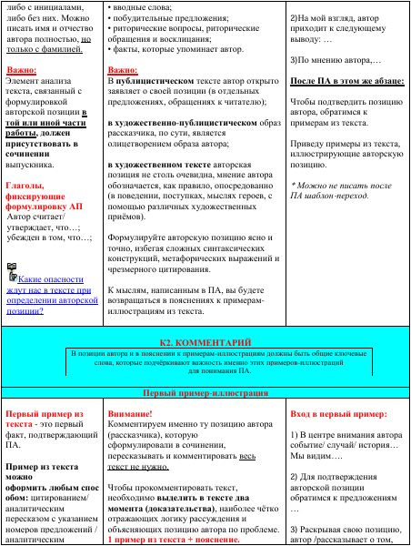 К2. Комментарий: как найти пример в тексте и правильно его оформить; каким должен быть пример, чтобы его засчитали; какими способами можно оформить пример-иллюстрацию; пошаговая работа с примером из текста (5 верных шагов), список маркеров комментария, рекомендации; вход в 1 пример/2 пример (5 + 6 шаблонов), шаблоны для текста с рассказчиком, шаблоны для логических переходов внутри примера (4); глаголы, передающие способы авторского подхода к раскрытию проблемы; глаголы, передающие мысли, особо важные автору; за что можно получить 0 баллов по К2.