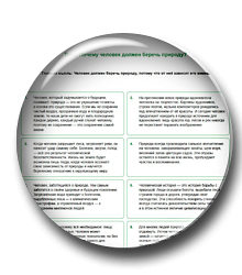 На карточках основные части сочинения: главные и развивающие тезисы, примеры и выводы. Но это не совсем конструктор. Тексты составлены так, что часть из них можно сопоставить, а часть нет. Здесь есть неплохо написанные, но лишние части, есть с нужной мыслью, но плохо написанные, есть прямое повторение тезисов, что не даёт развития мысли, есть абсурдные тезисы, тезисы с фактическими, стилистическими и иными ошибками. Если будете сопоставлять литературные примеры с тезисами, обнаружите, что окажутся лишние тезисы и лишние примеры, но часть из них совпадёт. Правильного ответа может вообще не быть или будет несколько правильных ответов. Объединяет эти тексты один принцип - везде будут одни и те же ключевые слова и их синонимы. Если не вчитываться, то кажется, что всё ко всему подходит. Упражнение не позволяет скользить мысли, не вдумываясь в смысл каждого слова.