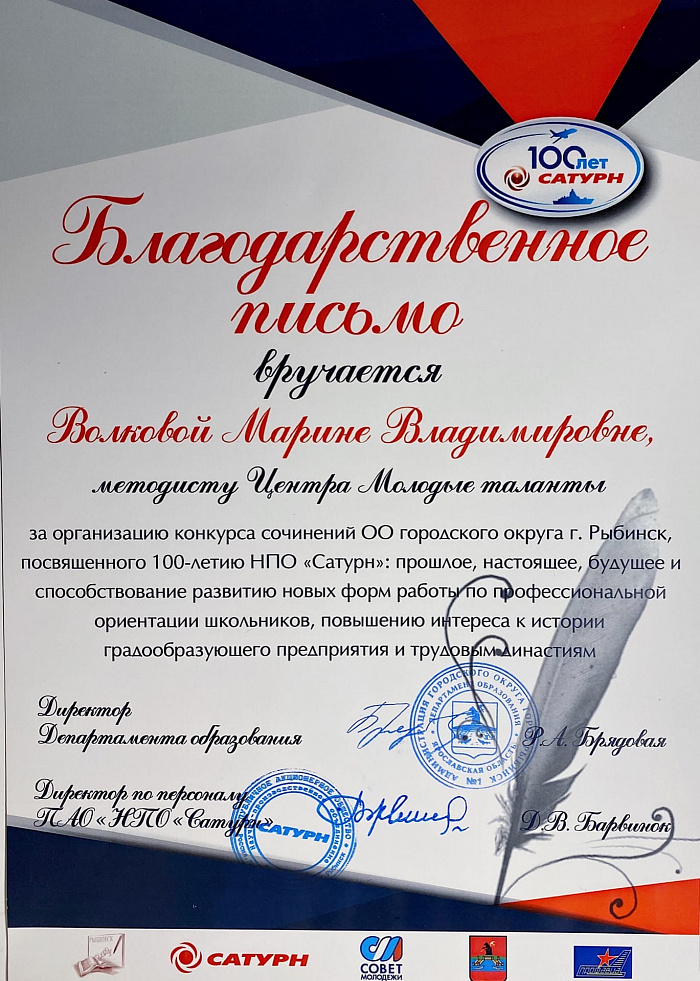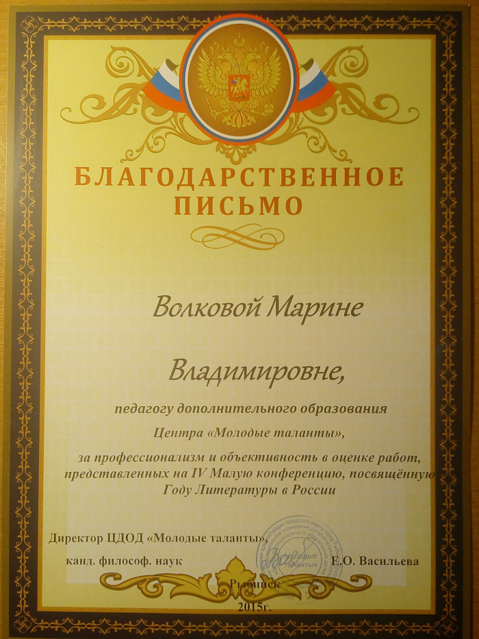 Благодарственное письмо за работу в экспертной комиссии городской научной конференции школьников