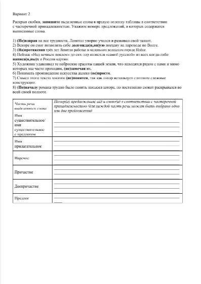 Каждый вариант состоит из восьми предложений, в которых выделено слово, требующее морфологического и орфографического анализа.